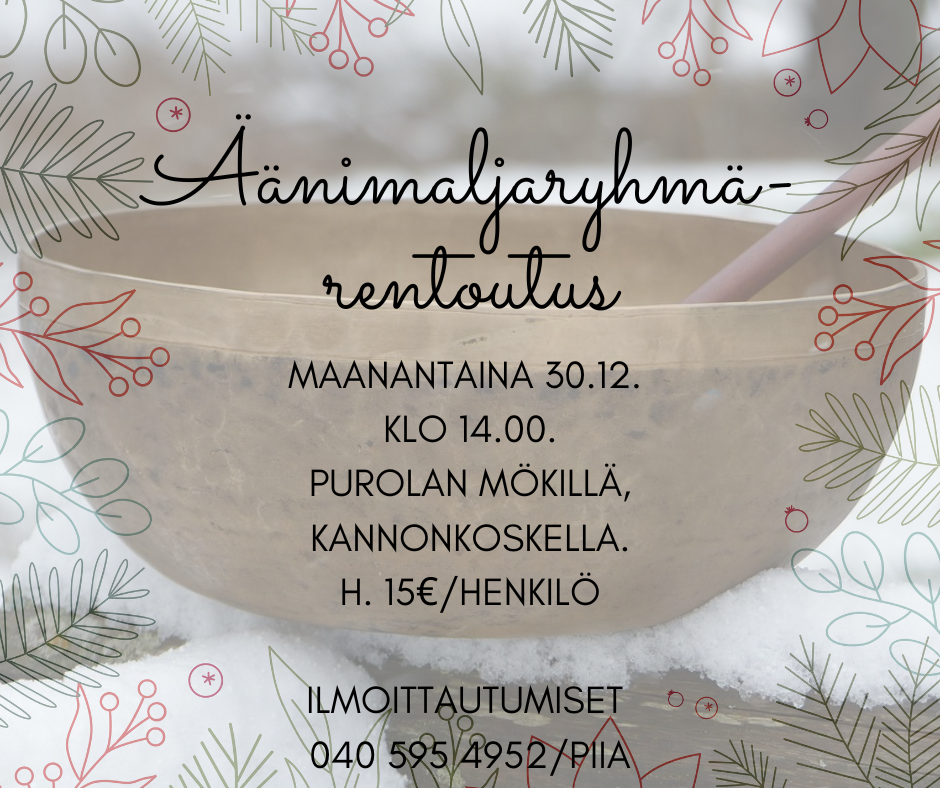 Keskellä joulun tohinaa on hyvä ottaa hetki itselleen. Tervetuloa äänimaljaryhmärentoutukseen Purolan mökille (Purolantie 75) Kannonkoskelle. Ryhmään mahtuu 6 henkilöä. Hintaan sisältyy tee ja suklaatarjoilu. Pukeuduthan hetkeen mukaviin vaatteisiin ja villasukkiin. Minä tarjoan rentoutukseen joogamaton, tyynyn